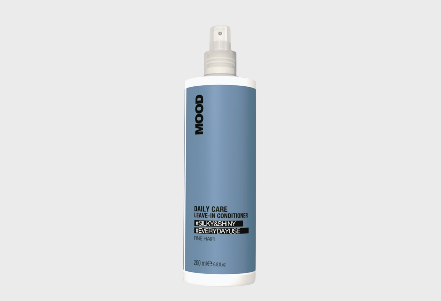 MOOD Daily Care Leave-In Conditioner – instant detangling spray. Protects fine hair from static, adds strength & gloss without weighing down. Spray on wet or dry hair, no rinsing needed. Perfect post-workout refresh. 200ml.