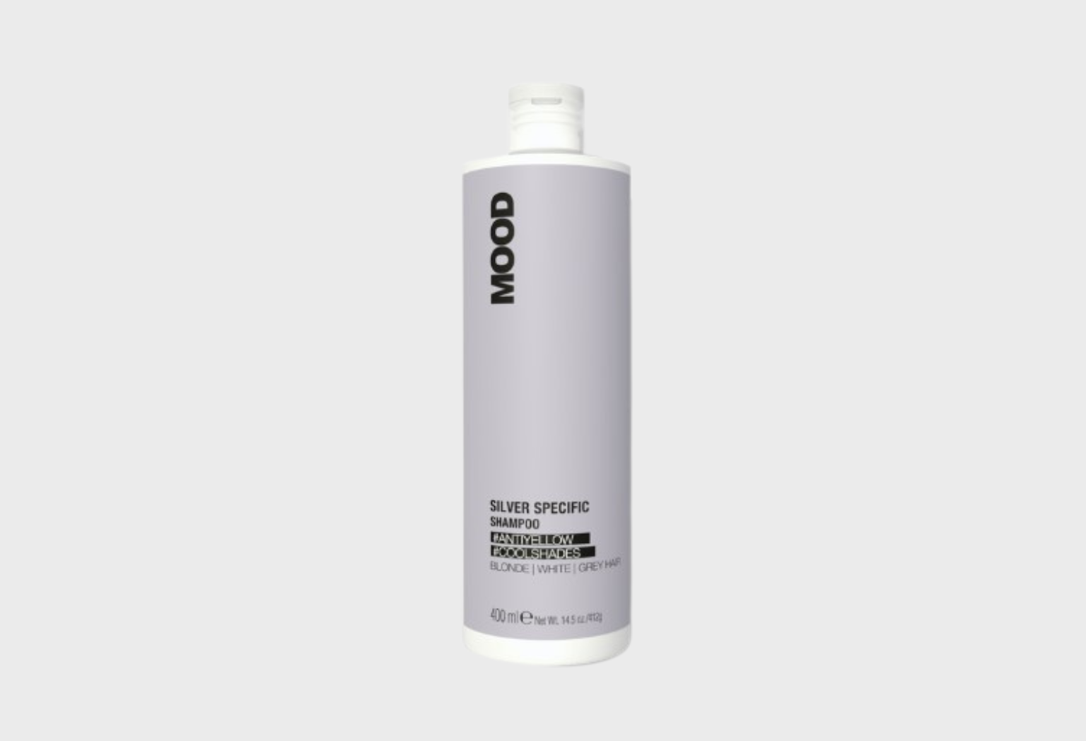 MOOD Silver Specific Shampoo – purple shampoo eliminates brassy yellow tones. Perfect for grey, white, blonde, highlighted hair. Violet pigments neutralise yellow, Blueberry extract provides antioxidants. Leave 2-5 mins for intensity. Use 1-2x weekly. 400ml.